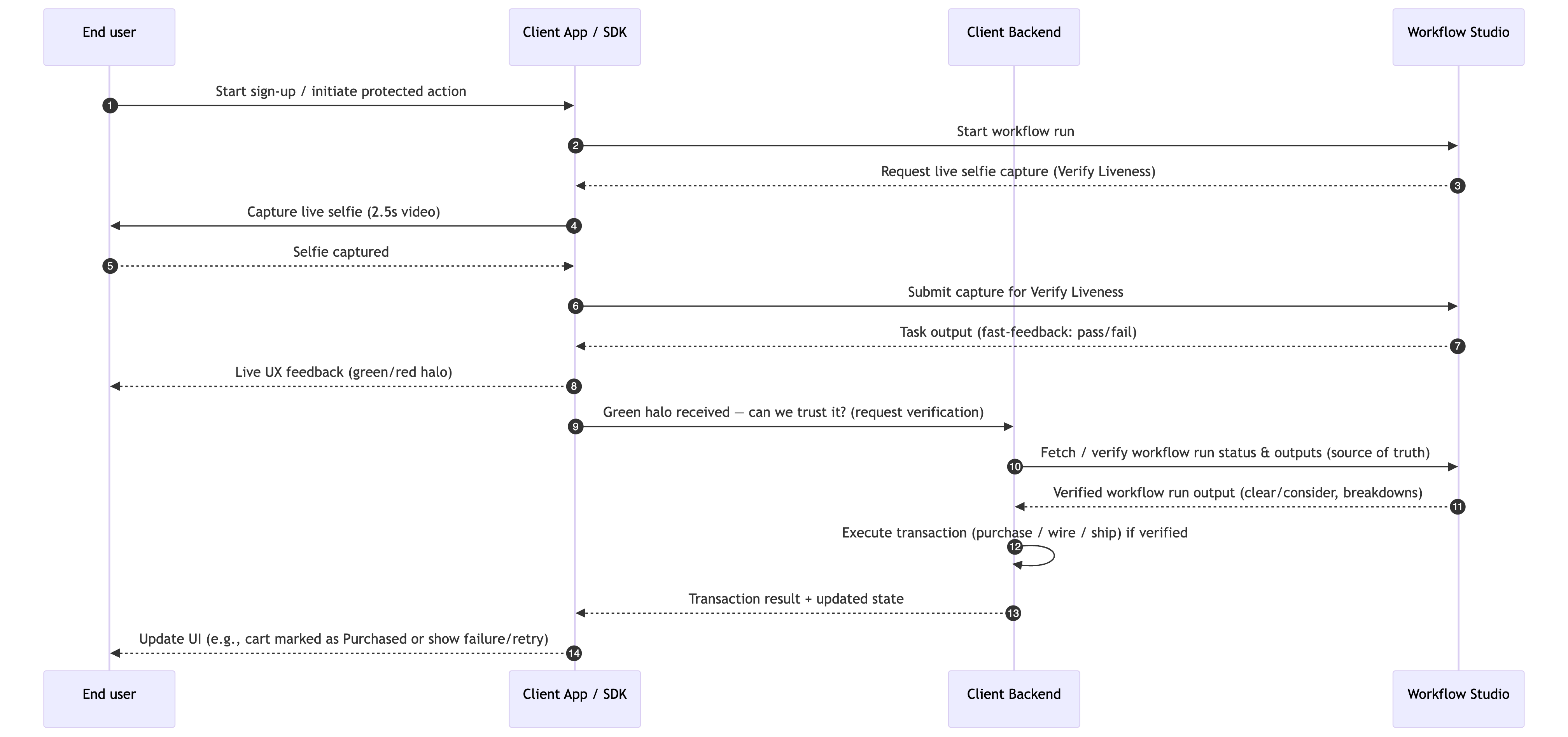 The SDK/app uses the Liveness Verification task fast-feedback to display the green or red halo. The client backend independently verifies the final workflow output with Workflow Studio (source of truth) before authorizing any protected action.