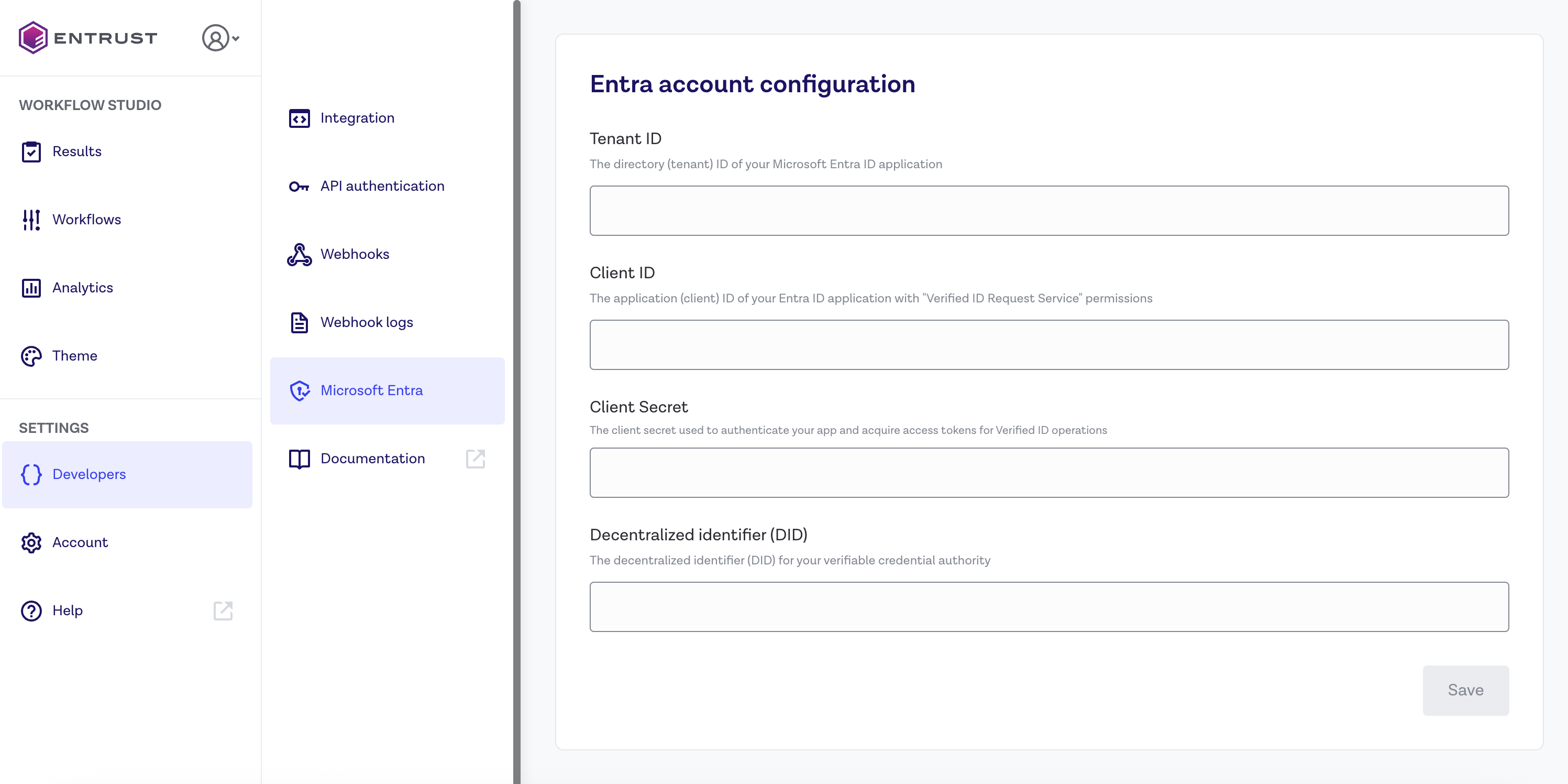In order to use the Verified ID solution with Entrust Studio, you must configure your Microsoft Entra account and create a new credential definition.