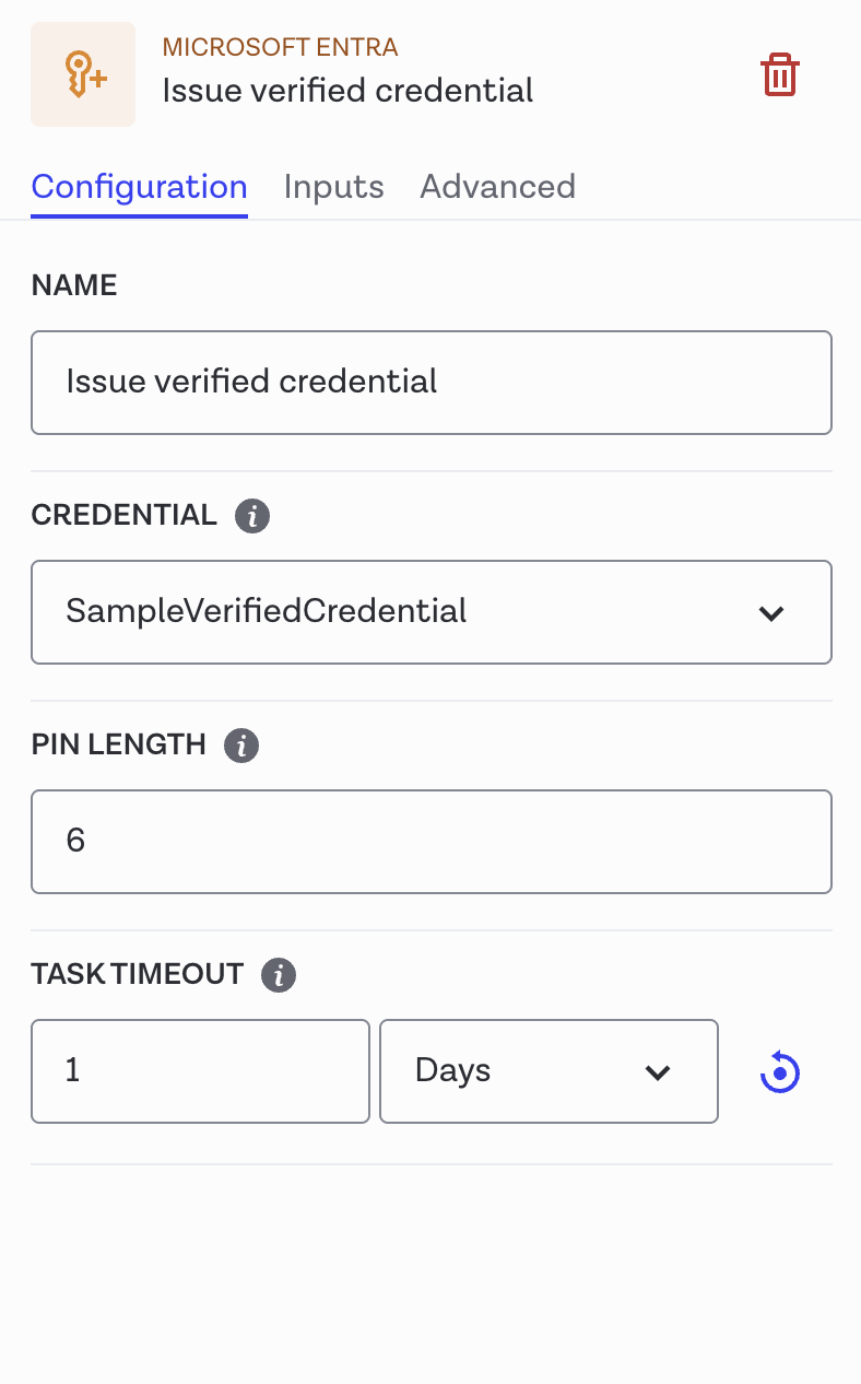 - credential - select a credential definition from the Credential dropdown list. This should match the credential selected in the Issue verified credential task