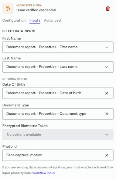 The workflow task takes data as inputs captured during the Studio workflow, including the applicant's first and last name (required), as well as the optional inputs of the applicant's date of birth, identity document type, a photo ID (referencing the captured biometric media) or any encrypted biometric token data. Upon successful identity verification, the task initiates the issuance process with Microsoft Entra. It generates a verified credential offer, presented as a QR code (for web users) or a button (for mobile users), allowing the applicant to claim and save the credential in their Microsoft Authenticator wallet.