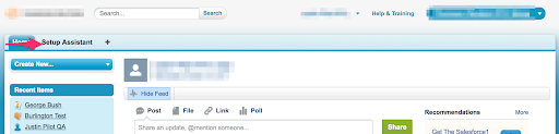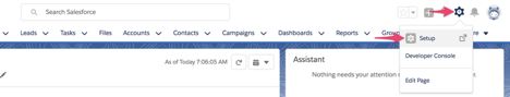 Throughout the installation, you will be instructed to navigate through Setup. To do so, select the gear to the upper right and then Setup. Once in Setup, you can use the Quick Find box to find and navigate to the appropriate section: