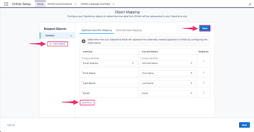 - Click Add Row to add Onfido's fields to the Salesforce Fields (Note: If there are fields that are unmapped they will be removed.)