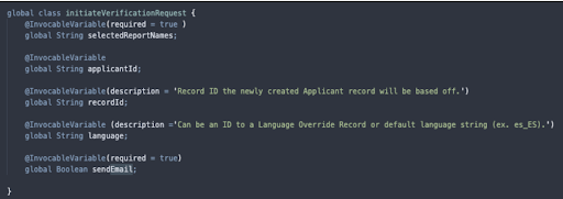 - A global invocable method will be added to the package that will perform the initialization of a verification check with Onfido by making the required API calls and setting the required values on records within the Salesforce database. Admins will be able to use this method within lightning flows, process builder, etc.