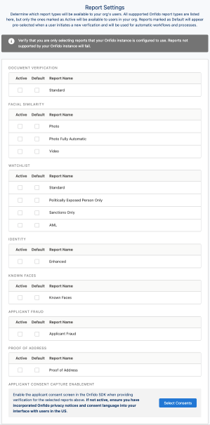 - The default report types setup screen will be upgraded to include a Consent capture flag, which will cause the org to use Onfido's consent screen in verification flows if checked.