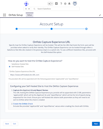 Now you will have to enter the URL of the Salesforce site that will be used to accept status updates and other data coming from Onfido